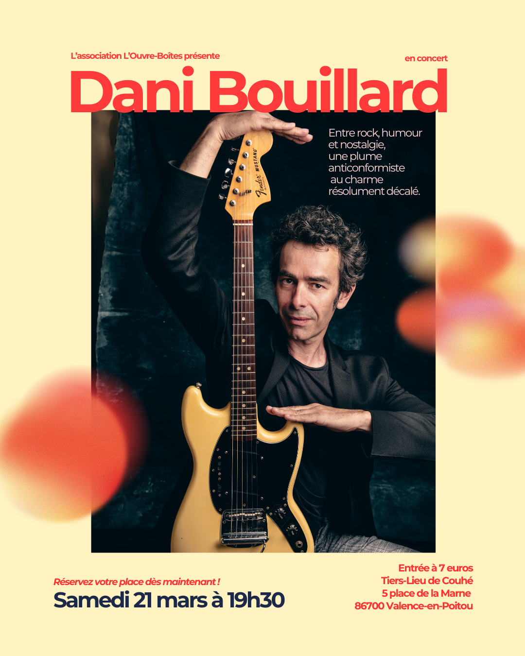 Samedi 21 mars 2026 - 19:30 Association L'Ouvre-Boîtes - Tiers-lieu de Couhé - 5 place de la Marne - 86700 Valence-en-PoitouEntre rock, humour et nostalgie, une plume anticonformiste au charme résolument décalé.