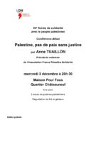 Mercredi 03 décembre 2025 - 20:30 Maison pour Tous - 10 rue du Nouveau Brunswick - 86100 ChâtelleraultLa LDH Châtellerault vous invite à la 24e Soirée de solidarité avec le peuple palestinien Conférence-débat "Palestine, pas de paix sans justice" par Anne TUAILLON, Présidente nationale de l’Association France Palestine Solidarité Lecture de poèmes palestiniens Dégustation de thé et gâteaux