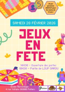 Samedi 28 février 2026 - 14:30 École élémentaire Micromégas à St Eloi - 4 rue Voltaire - 86000 PoitiersVenez entre amis, famille, voisins découvrir les nombreux jeux grâce aux animateurs de l’association les aslonturiers. Avec à 18h30 : une partie de loup garou Entrée à 2€, gratuite pour les moins de 13 ans ! Petite restauration sur place.