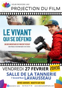 Vendredi 27 février 2026 - 20:30 Salle de la Tannerie - 7 grand'rue - 86470 LavausseauL’association PETAL vous propose la projection du film « Le vivant qui se défend », un documentaire de Vincent Verzat. Il retrace son cheminement entre militantisme et naturalisme ainsi que sa recherche d’un équilibre entre combat et contemplation. Entrée gratuite – Buvette sur place.