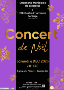 Samedi 06 décembre 2025 - 20:30 Eglise Notre Dame du Planty - 1 avenue de l'Entraide - 86180 BUXEROLLESL'Harmonie Municipale de Buxerolles organise son concert de NOEL le Samedi 6 Décembre à 20H30 dans l'Eglise Notre Dame du Planty à Buxerolles, avec, pour invité d'honneur, l'Orchestre d'Harmonie Sortilège (+ de 60 musiciens). Venez nombreux pour cette belle soirée musicale...