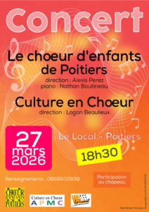 Vendredi 27 mars 2026 - 18:30 Le Local - 16 Rue Saint-Pierre-le-Puellier - 86000 PoitiersLa chorale de la DRAC et le Chœur des Enfants de Poitiers s’unissent pour un concert exceptionnel. Une rencontre intergénérationnelle unique où la maturité des adultes rencontre l’énergie des jeunes talents. Un rendez-vous musical sous le signe du partage.