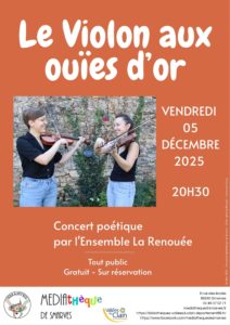 Vendredi 05 décembre 2025 - 20:00 Médiathèque de Smarves - 8 rue des Ecoles - 86240 SmarvesVendredi 05 décembre 20h30 Concert poétique par l'Ensemble La Renouée Ce concert propose un moment de partage autant musical que poétique, à la rencontre de deux violons baroques partant sur les chemins de contes et de fables aux histoires surprenantes, aventureuses et rêveuses.