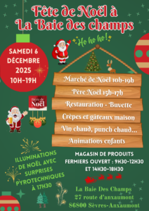 Samedi 06 décembre 2025 - 10:00 La Baie des Champs - 27 Rte d'Anxaumont - 86800 Sèvres-AnxaumontLa magie de Noël à La Baie des Champs. Marché de Noël de 10h à 19h, plus de 25 exposants. Magasin de produits fermiers ouvert toute la journée. Photos avec Père Noël 15h à 17h. Animations et surprises enfants. Illuminations de Noël à 17h30. Buvette : vin chaud, bière de Noël. Restauration sur place.