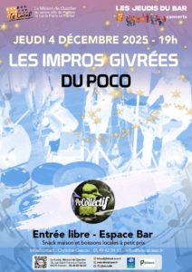Jeudi 04 décembre 2025 - 19:00 Le Local - Espace Bar - 16 rue Saint-Pierre-Le Puellier - 86000 PoitiersLes Jeudis du Bar invite le Po Collectif pour une session d’improvisations givrées qui mêleront musique et danse. Les artistes développent leur complicité pour nous donner des moments uniques d'émotion.