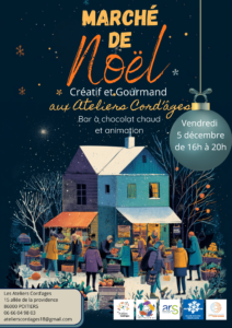 Vendredi 05 décembre 2025 - 16:00 Les Ateliers Cord'âges - 15 allée de la Providence - 86000 PoitiersMarché caritatif de 16h à 20h. Stands tenus par des adhérents et par des exposants professionnels (photographie, crochet, couture, littérature..). Venue d'une fanfare et d'un conteur. Venez nombreux déguster un bon chocolat chaud !