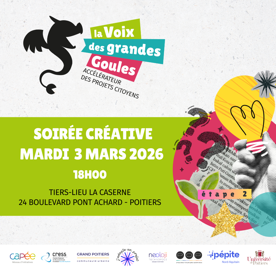 Mardi 03 mars 2026 - 18:00 La Caserne - 24 boulevard Pont-Achard - 86000 POITIERSCette soirée est l'occasion de partager un moment convivial tout en travaillant collectivement à transformer des idées en projets. Devenez acteur avec nous d’une dynamique enthousiaste où chacun de nous a sa place pour construire des solutions répondant à des enjeux spécifiques à notre territoire.