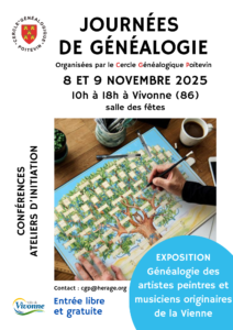 Samedi 08 novembre 2025 - 10:00 Salle des fêtes - Parc de Vounant, avenue de Bordeaux - 86370 VIVONNELe Cercle Généalogique Poitevin donne rendez-vous à tous les amateurs, passionnés ou simples curieux de généalogie à Vivonne le samedi 8 et dimanche 9 novembre de 10h à 18h.. Des échanges et conseils pour bien démarrer sa généalogie, des ateliers d'initiation, une exposition sur les artistes peintes