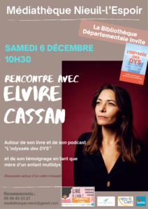Samedi 06 décembre 2025 - 10:30 Médiathèque de Nieuil - 1 route de Nouaillé - 86340 Nieuil l'EspoirElvire CASSAN est journaliste, podcasteuse et autrice mais aussi maman d'une fillette multi-dys. Elle a choisi d'en faire un livre L'Odyssée des Dys (Stock, 2024) pour rendre visible ces troubles de l'apprentissage synonymes de combats permanents pour les familles.