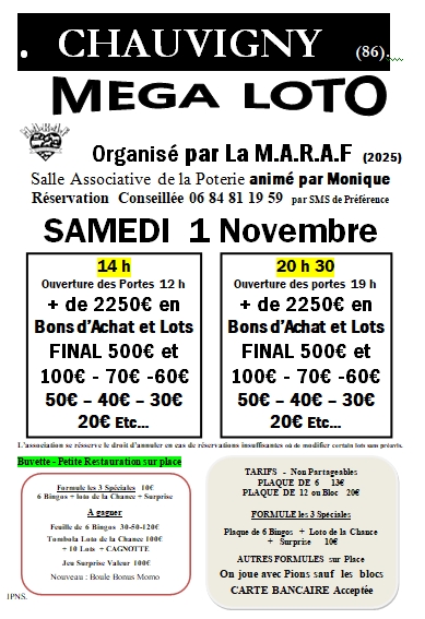 Samedi 01 novembre 2025 - 20:30 Salle de la Poterie - Avenue de la Vienne - 86300 Chauvigny+ de 2250€ en BONS D’ACHAT FINAL 500€ et 100€ -70€ - 60€ -50€ -40€ - 30€ Etc.… Bingo 1l.30€-2l.50€-3l.120€ Surprise valeur 100€ Loto de la Chance 100€ + Tombola + Cagnotte mini 50€ PLAQUE DE 6 13€ - PLAQUE DE 12 où Bloc 20€ FORMULE 3 Jeux 6 Bingos + Loto de la Chance + Surprise 10€