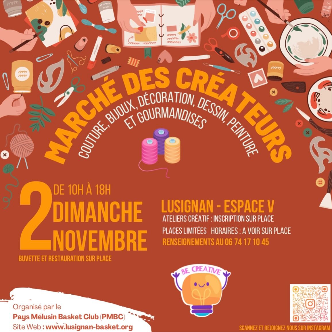 Dimanche 02 novembre 2025 - 10:00 ESPACE 5 - Salle des fêtes - Route de Jazeneuil - 86600 LUSIGNANLe PMBC organise son traditionnel marché de créateurs. de nombreux exposants seront présents pour vous présenter leurs créations (décos, bougies, bijoux, sacs, bois, crochets...). Possibilité d'ateliers sur place. On vous attends nombreux. Entrée libre. Restauration et buvette sur place.