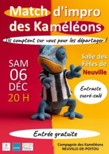 Samedi 06 décembre 2025 - 20:00 Le Majestic - Neuville-de-Poitou - Place Aristide Briand - 86170 NEUVILLE-DE-POITOUMatch d'improvisation de la Compagnie théâtrale des Kaméléons. Venez départager nos équipes, jeunes et adultes ! Rire garanti ! Tout public. Entrée gratuite.