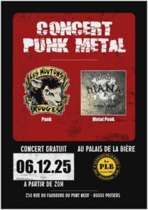 Samedi 06 décembre 2025 - 20:00 Le Palais de la Bière - 250 rue du Faubourg du Pont Neuf - 86000 PoitiersLes punks de Niort débarquent au Palais de la bière à Poitiers pour enflammer la scène jusqu'au bout de la nuit ! Au programme : - Les Moutons Rouges (Punk) - MANA (Punk Métal)
