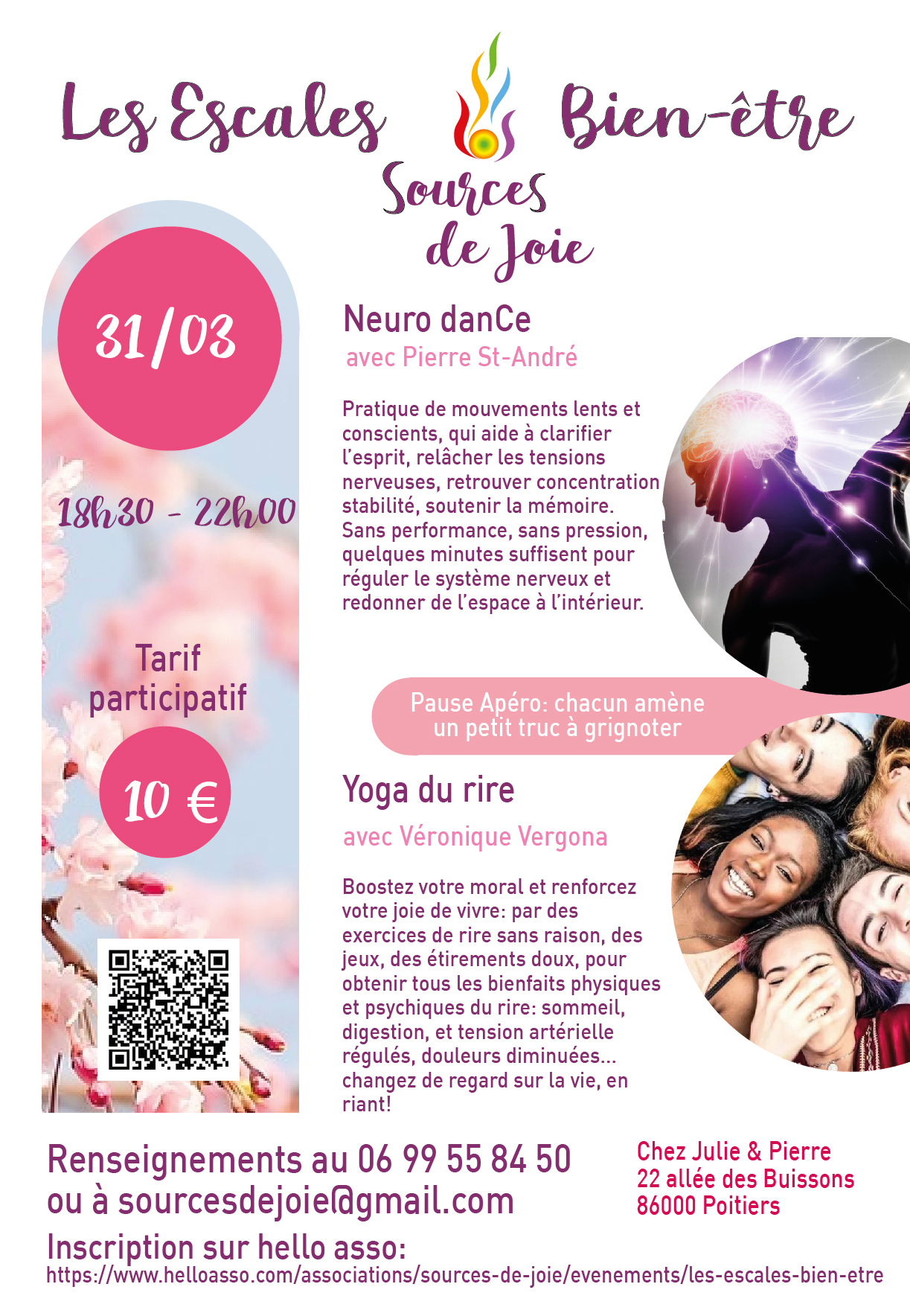 Mardi 31 mars 2026 - 18:30 Chez Pierre & Julie - 22 allée des Buissons - 86000 PoitiersPrenez une pause en après-midi ou en soirée: découvrez des pratiques variées qui procurent un bien-être profond et durable. Nos intervenants vous accompagnent vers une détente, une reconnexion salutaire à l'essentiel: corps et esprit harmonisés. le 31/03: Neuro dance & Yoga du rire.