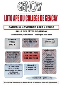 Samedi 08 novembre 2025 - 20:30 salle des fêtes - rue du chemin brun - 86160 GençayLoto de l'APE du collège de Gençay