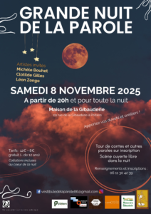 Samedi 08 novembre 2025 - 20:00 Maison de la Gibauderie - 111 rue de la Gibauderie - 86000 Poitiers4e Grande Nuit de la Parole de l'association Vestibule de la Parole, ouverte aux conteurs, slameurs, poètes, musiciens, lecteurs.... Avec Michèle Bouhet, Clotilde Gilles et Léon Zongo. Toute la nuit, de 20h au petit déjeuner. Apportez vos duvets et vos oreillers !