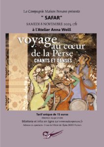 Samedi 08 novembre 2025 - 17:00 Atelier ANNA WEILL - 3 rue de l'Abbé de l'Epée - 86000 POITIERSSafar - voyage en persan- est une proposition faite pour plonger au cœur de la langue et de la musique persane (savante et /ou contemporaine) dans lequel divers tableaux chorégraphiés de danse soufie, moyen-orientale, vous serez inviter à l'écoute, au recueillement, à la danse aussi. Durée : 1h30