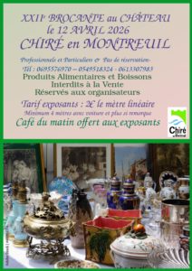 Dimanche 12 avril 2026 - 06:00 Chire en Montreuil - 2 rue Moulin Rochefort et chateau - 86190 Chire en Montreuil22e Brocante au château à Chiré en Montreuil Dimanche 12 avril 2026 Brocante et Vide grenier & Professionnels et Particuliers Infos Exposants et Visiteurs Pas de réservation préalable pour les exposants, mise en place à leur arrivée sur lieu.