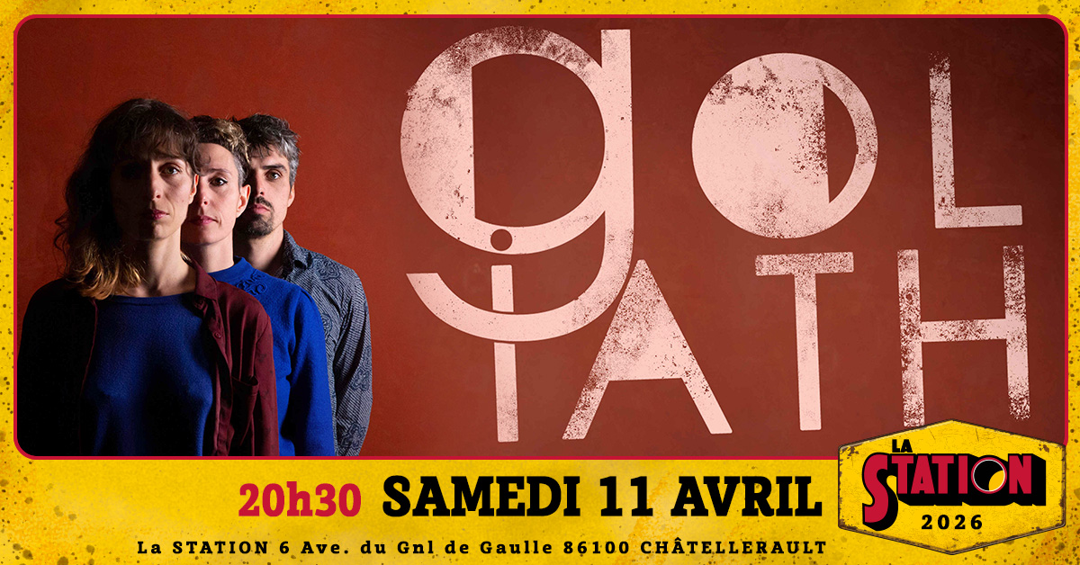 Samedi 11 avril 2026 - 20:30 La Station - 6 avenue du Général de Gaulle - 86100 ChâtelleraultGoliath est un trio de chanson française aux talents pluriels, qui compose ensemble. Guidés par une approche intuitive et une culture musicale variée, les rythmes et les couleurs offrent un écrin où la poésie du groupe vient se nicher.