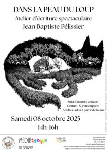 Samedi 08 novembre 2025 - 14:00 Médiathèque de Smarves - 8 rue des Ecoles - 86240 SmarvesDans la peau du loup : Atelier d'écriture spectaculaire Samedi 8 novembre 14h-16h.Animé par Jean-Baptiste Pélissier "Écrire en meute, les sens en alerte, sur la piste de l’inspiration. L’atelier sera suivi d’un mini-concert thématique, histoire de se quitter en chanson.