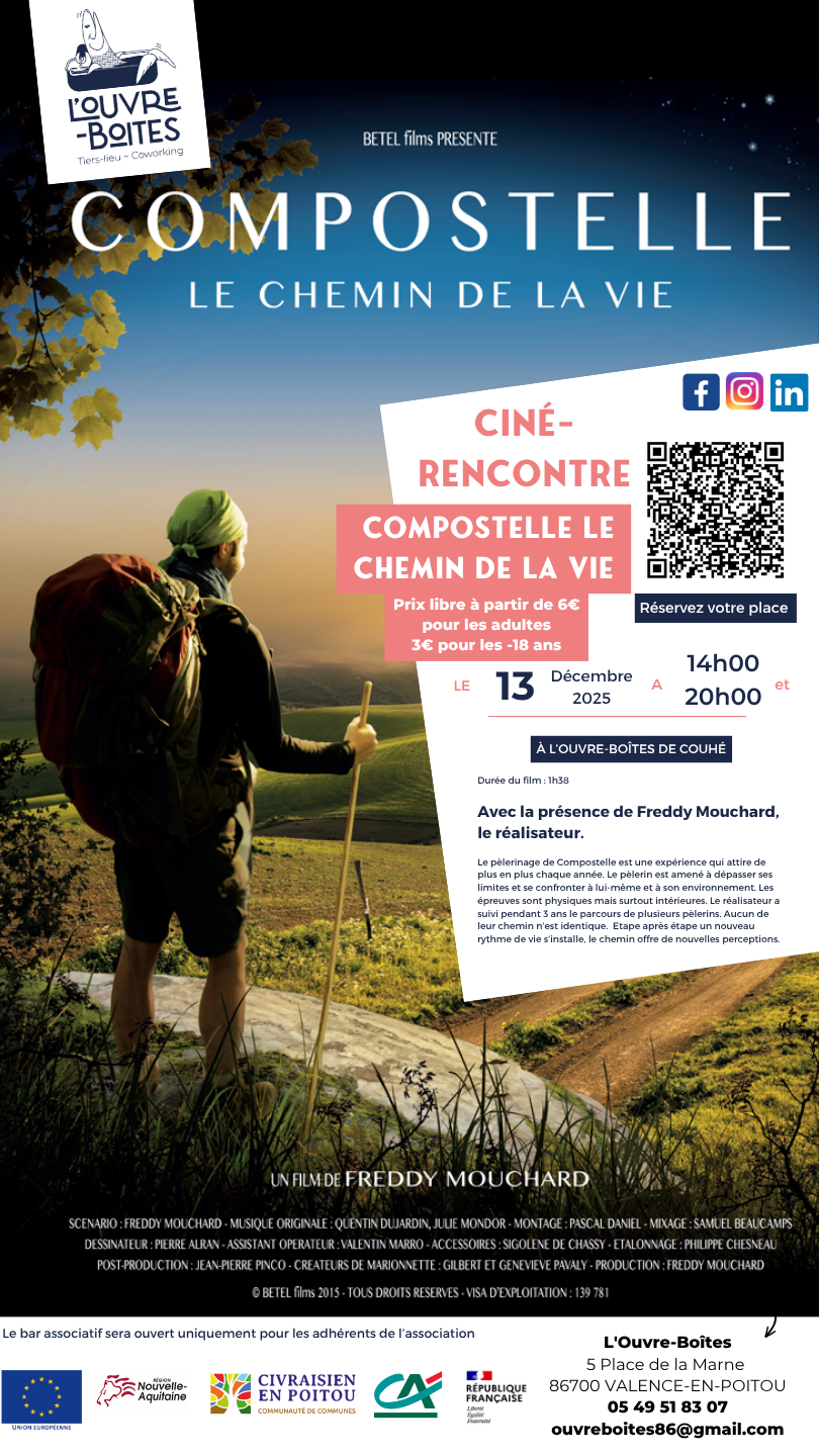 Samedi 13 décembre 2025 - 14:00 L'Ouvre Boîtes - 5 place de la marne - 86700 Valence-en-PoitouDurée du film : 1h38 Avec la présence de Freddy Mouchard, le réalisateur. Le pèlerinage de Compostelle est une expérience qui attire de plus en plus chaque année. Le pèlerin est amené à dépasser ses limites et se confronter à lui-même et à son environnement.