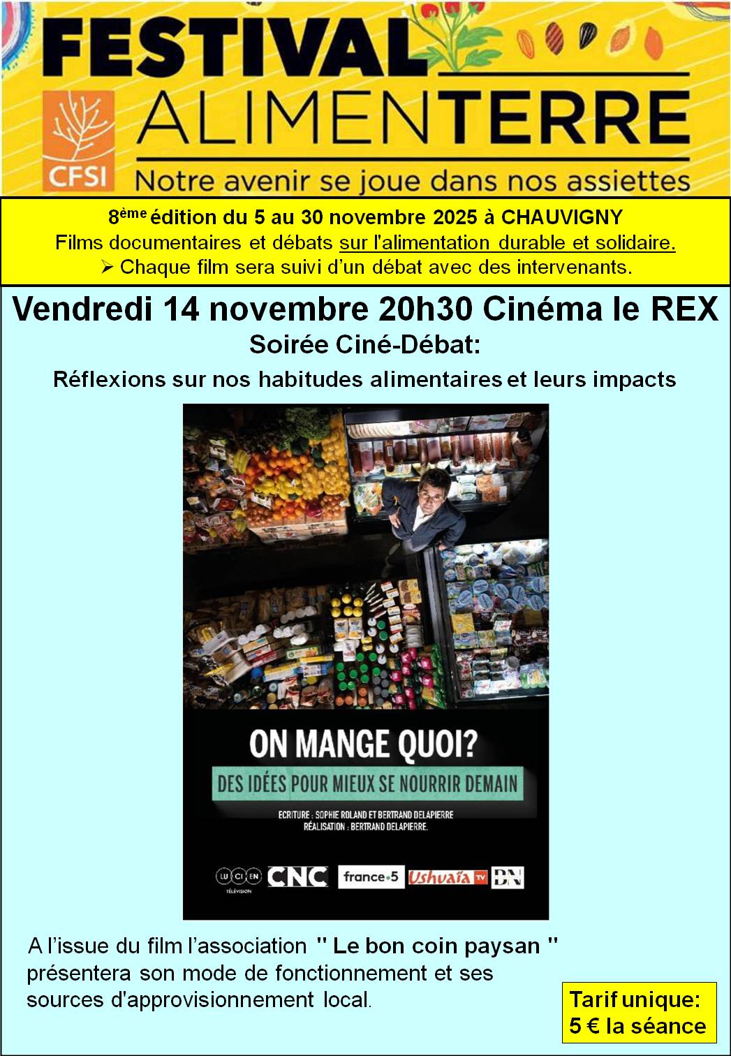 Vendredi 14 novembre 2025 - 20:30 Cinéma LE REX - 10 rue de St Savin - 86300 CHAUVIGNYDans le cadre du festival Alimenterre, projection du film "On mange quoi, des idées pour mieux se nourrir demain". A la suite du film, l’association "Le bon coin paysan »« présentera son mode de fonctionnement et ses sources d'approvisionnement local.