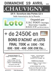 Dimanche 19 avril 2026 - 14:00 Salle de la Poterie - Avenue de la Vienne - 86300 ChauvignyPLAQUE DE 6 13€ - PLAQUE DE 12 où Bloc 20€ FORMULE 3 Jeux 6 Bingos + Loto de la Chance + Surprise 10€ AUTRES FORMULES sur Place TARIFS - Non Partageables + de 2150€ BONS D’ACHAT FINAL 400€ et 100€ - 60€ -50€ -40€ - 30€ Etc.… Bingo 1l.30€-2l.50€-3l.120€ Chance