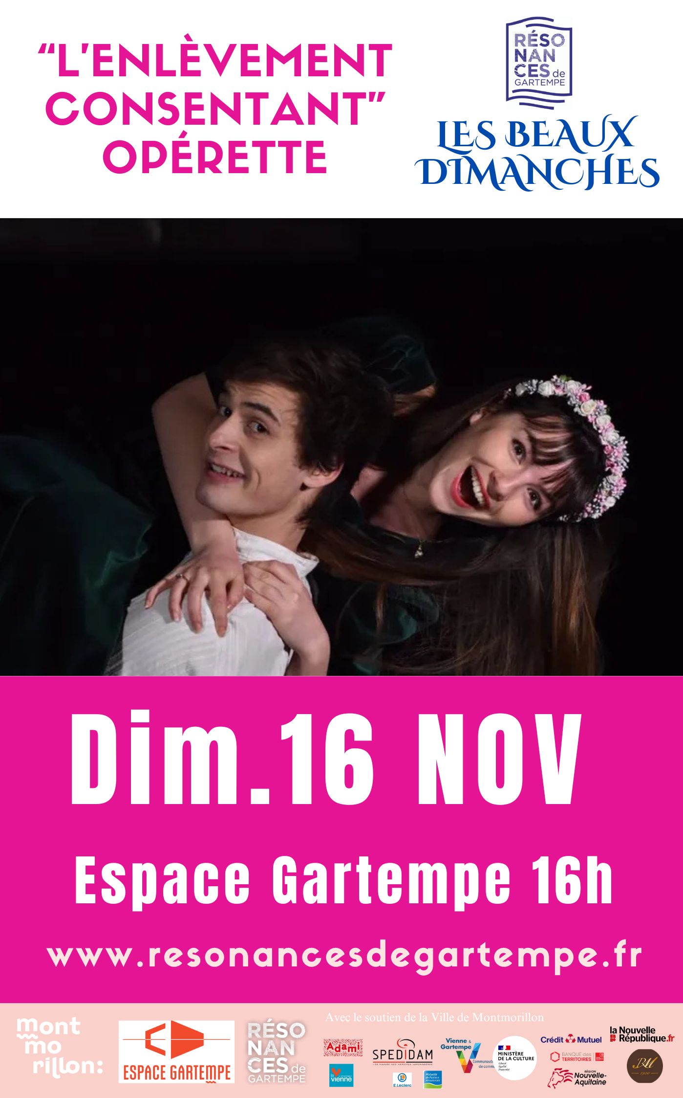 Dimanche 16 novembre 2025 - 16:00 Salle "Espace Gartempe" - 16 Bd du Terrier Blanc - 86500 MontmorillonCette opérette en trois tableaux écrite par A.Divaret, pleine de fantaisie, de joie et d'humour réunit sept jeunes talentueux artistes, comédiens et chanteurs, et un orchestre de 20 musiciens. Un œuvre qui réunit chant, danse, théâtre, escrime, combat, musique, acrobaties et encore plus!