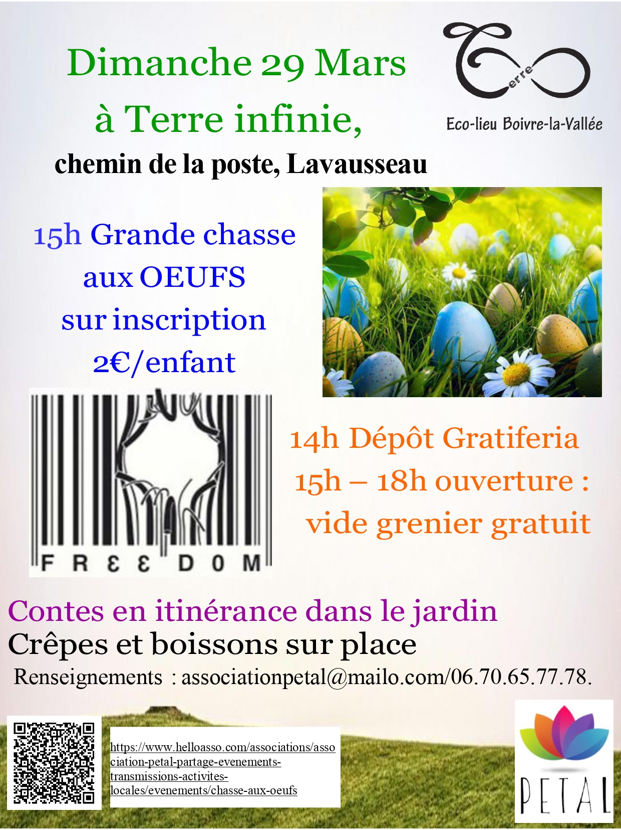 Dimanche 29 mars 2026 - 15:00 Terre Infinie - Chemin de la poste - 86470 Boivre-la-valléeVenez participer à une grande chasse aux œufs dans le jardin de Terre Infinie. Contes en itinérances et gratiferia (dépôt à 14h). Buvette et crêpes en vente sur place. www.helloasso.com/associations/association-petal-partage-evenements-transmissions-activites-locales/evenements/chasse-aux-oeufs