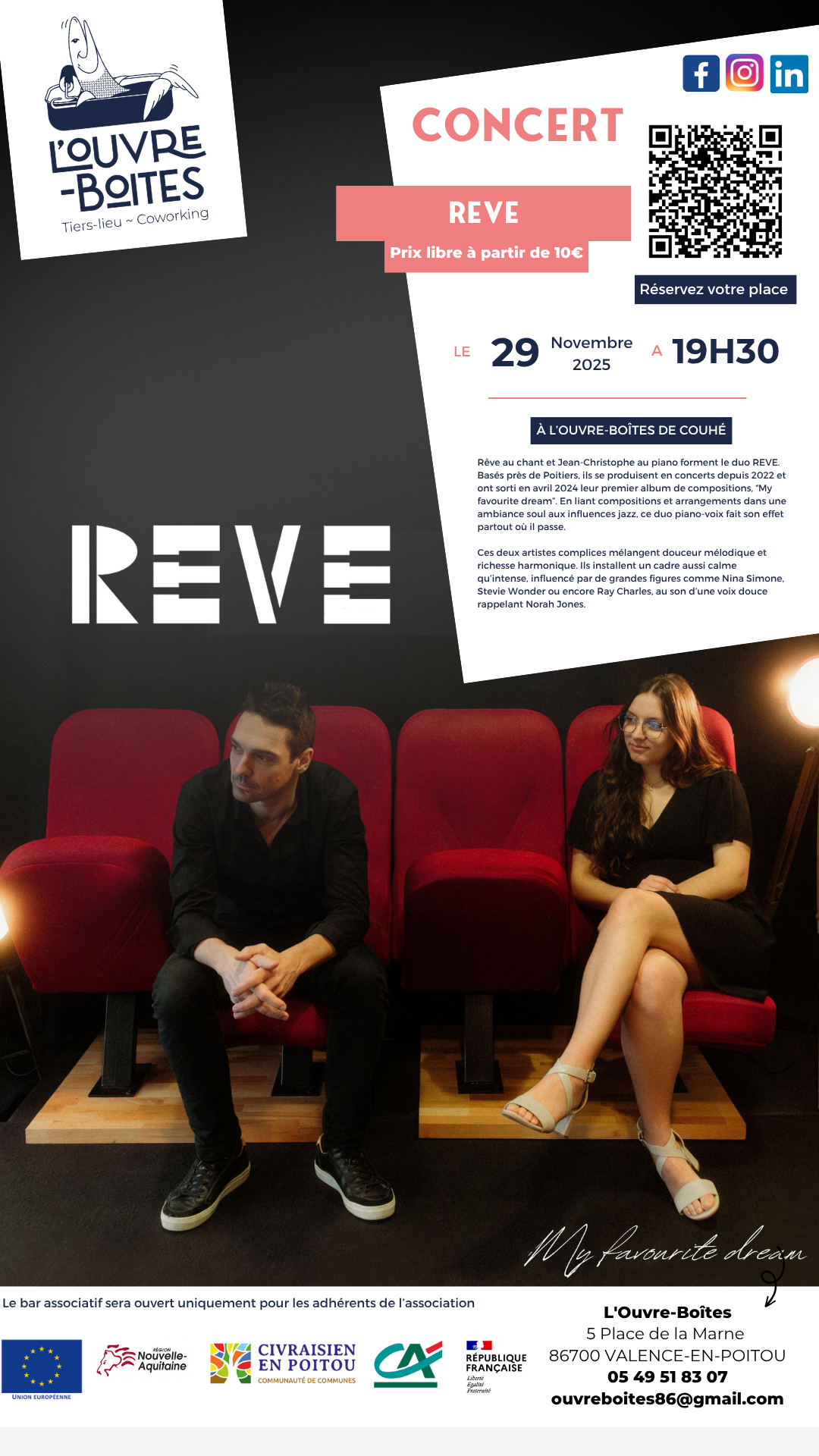 Samedi 29 novembre 2025 - 19:30 L'Ouvre-Boîtes - 5 place de la Marne - 86700 Valence-en-PoitouRêve au chant et Jean-Christophe au piano forment le duo REVE. Basés près de Poitiers, ils se produisent en concerts depuis 2022 et ont sorti en avril 2024 leur premier album de compositions, “My favourite dream”. En liant compositions et arrangements dans une ambiance soul aux influences jazz.