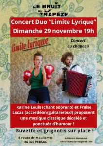 Samedi 29 novembre 2025 - 19:00 LE BRUIT DU TRAPEZE - 8 rte de Moulisme - 86320 PersacLe duo Limite Lyrique est composé de Karine Louis (chant soprano) et de Fraise Lucas (accordéon/guitare/oud). Leur rencontre a lieu dans le Tarn en 2019, avec l’idée de jouer de la musique classique dans la rue, pour la faire connaître au plus grand nombre, de façon impromptue.