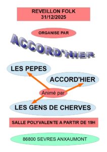 Mercredi 31 décembre 2025 - 19:00 SALLE POLYVALENTE - route de bignoux - 86800 SEVRES ANXAUMONTl'association ACCORD'HIER organise un réveillon folk ouvert à tous. 15€ par adulte. les participants s'occupe de leurs panier réveillon et de leurs couverts. paiement à la réservation par avance car places limitées à 150 personnes. soirée animée par les PEPES, LES GENS DE CHERVES et ACCORD'HIER.