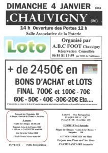 Dimanche 04 janvier 2026 - 14:00 Salle de la Poterie - Avenue de la Vienne - 86300 Chauvigny+ de 2450€ en BONS D’ACHAT et LOTS B.A FINAL 700€ et 100€ -70€ - 60€ -50€ -40€ - 30€ Etc.… TARIFS Non Partageables PLAQUE DE 6 13€ - Plaque de 12 20€ FORMULE et AUTRES FORFAITS sur Place. Possibilité de jouer au marqueur (bloc FORMULE Partie Spéciale : 6 Bingos + Loto de la Chance + Surprise