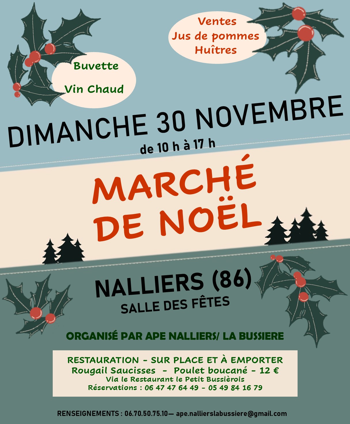 Dimanche 30 novembre 2025 - 10:00 Salle des Fêtes - rue des Ecoles - 86310 Nalliersorganisé par l'APE Nalliers - La Bussière restauration sur place et à emporter Buvette avec Vin chaud - huitres