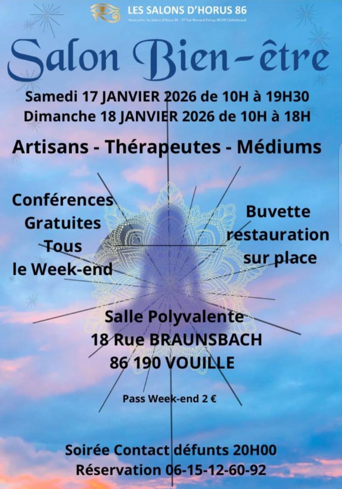 Samedi 17 janvier 2026 - 10:00 Salle des fêtes - 9 rue Braunsbach - 86190 VouilléPour Bien démarrer 2026 venez nous rencontrer pour la 2 ème Édition du Salon Bien-être organiser par l'association Les salons d'Horus 86, retrouvez une Quarantaine d'exposants Thérapeutes, Masseurs Énergéticiens, Masseurs, Numérologues Astrologues,Médiums et Artisans. Soirée Contacts Défunts