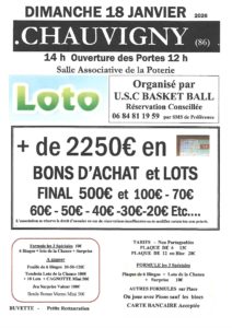 Dimanche 18 janvier 2026 - 14:00 Salle de la Poterie - Avenue de la Vienne - 86300 Chauvigny+ de 2250€ en BONS D’ACHAT et LOTS B.A FINAL 500€ et 100€ -70€ - 60€ -50€ -40€ - 30€ Etc.… TARIFS Non Partageables PLAQUE DE 6 13€ - Plaque de 12 20€ FORMULE et AUTRES FORFAITS sur Place. Possibilité de jouer au marqueur (bloc) FORMULE Partie Spéciale : 6 Bingos + Loto de la Chance + Surprise 10€