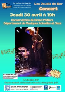 Jeudi 30 avril 2026 - 19:00 Le Local - Espace Bar - 16 rue Saint-Pierre-Le Puellier - 86000 PoitiersLes Jeudis du Bar donnent carte blanche aux départements Musiques Actuelles et Jazz du Conservatoire de Grand Poitiers. Venez découvrir ces jeunes talents et danser sur leurs rythmes pop, rock, rythm n'blues et jazz ! Boissons locales et snacks maison sur place à tout petits prix.