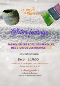 Rens : lebruitdutrapeze@gmail.com participation aux frais entre 3 et5 euros en fonction de l'objet réalisé
