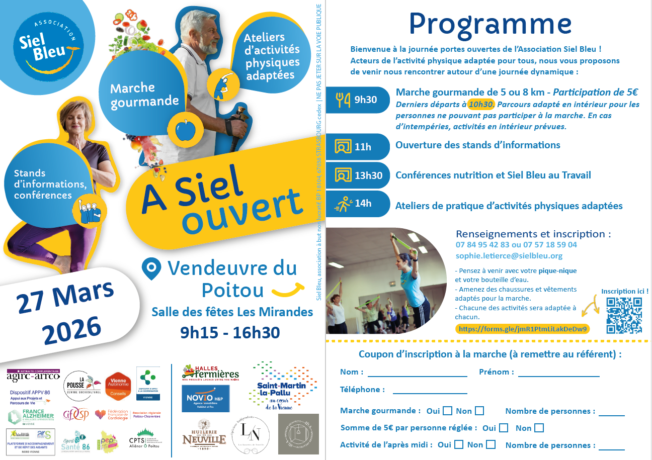 Vendredi 27 mars 2026 - 09:15 Salle des Mirandes - 7 rue Marguerite Yourcenar - 86380 Saint Martin La PalluL’association Siel Bleu 86 organise une grande journée « A Siel Ouvert », le vendredi 27 Mars 2026, sur la commune de Vendeuvre du Poitou, à la salle des Mirandes.