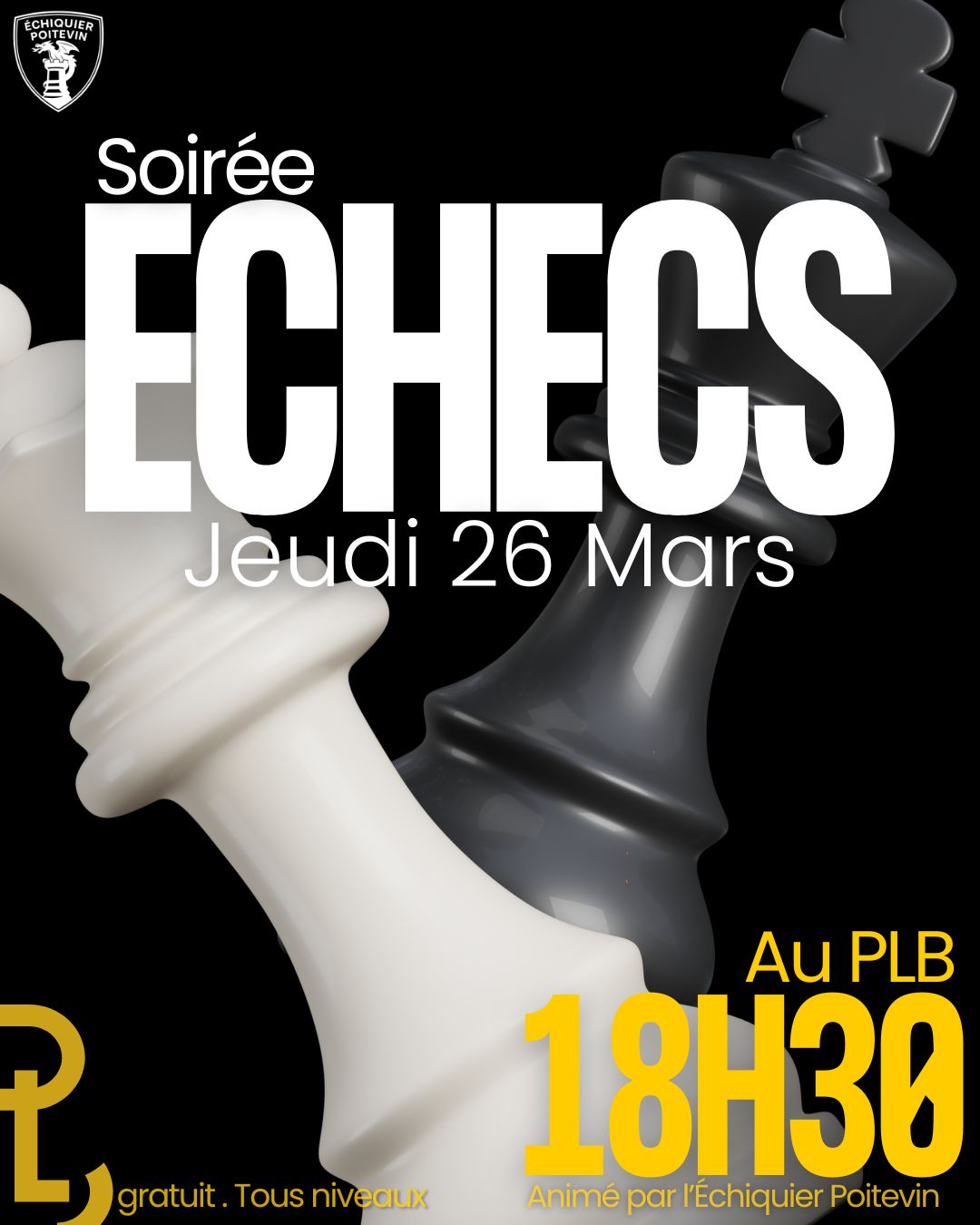 Jeudi 26 mars 2026 - 18:30 Le Palais de la Bière - 250 rue du Faubourg du Pont Neuf - 86000 PoitiersLes échecs sont bientôt de retour au PLB ! ♟️ Chaque dernier jeudi du mois, L'échiquier poitevin propose une soirée échecs. Que tu sois là pour apprendre et découvrir, ou pour défier les meilleurs joueurs poitevins, tu es le.a bienvenu.e ! 📆 Jeudi 26 mars – 18h30 👉 Gratuit – tous niveaux