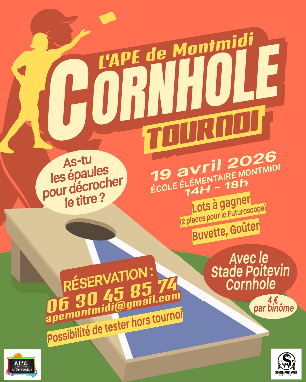 Dimanche 19 avril 2026 - 14:00 Ecole Elementaire Montmidi - 24 Rue de Montmidi - 86000 PoitiersTournoi de Cornhole à Poitiers – Dimanche 19 avril ! Rendez-vous à l’école élémentaire, 24 rue de Montmidi, pour un après-midi festif organisé avec le Stade Poitevin Cornhole. Inscriptions par binôme (au moins un adulte) de 13 h à 13 h 30, début du tournoi à 14 h. 4 € par binôme, lots à gagne