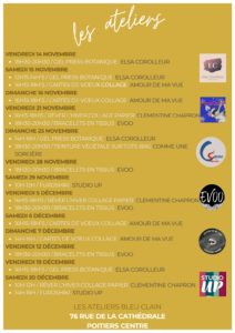 Vendredi 05 décembre 2025 - 15:15 Boutique Bleu Clain - 76 rue de la cathédrale - 86000 Poitiers - centre villeLe collectif de créatrices Bleu Clain propose 8 ateliers 6 intervenantes transmettent leurs techniques et leur créativité Fabriquez vos cartes de vœux, vos bracelets, teignez vos tote bags, emballez vos paquets de noël, tout cela avec des matériaux de réemploi et des matières végétales !