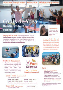 Mercredi 15 avril 2026 - 19:00 Yoga svadhyaya / Studio Anna Weill - 3 rue de l'abbé de l'épée Quartier Chilvert (derrière l'IRJS av. libération). - 86000 PoitiersCours d'1h : postures, renforcement musculaire, assouplissement, respiration, relaxation, méditation. Accessible à tous.tes. Essais et inscription toute l'année. Abo ou carte 5, 10 cours. LUN 17h15+18h30. MAR 12h30+18h15+19h30. MER 17h45+19h. VEN 11h15. Stages yoga-rando. Céline Delage, diplômée IFY
