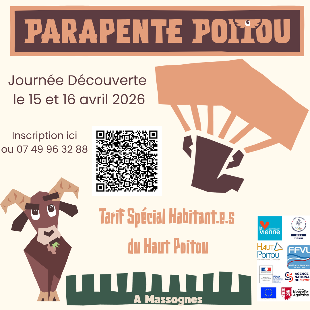 Mercredi 15 avril 2026 - 09:00 Ecole de parapente du Poitou - Salle Associative Liliane Cerez, rue de la Nicolière - 86170 MassognesJournée Découverte du parapente : appropriation matériel de vol et pratique au sol puis baptême de l'air en parapente biplace avec un moniteur diplômé. A partir de 14 ans, un tarif spécial pour les habitant.e.s du Haut Poitou est proposé