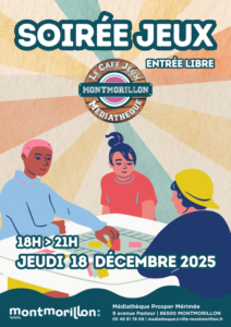Jeudi 18 décembre 2025 - 18:00 Café jeux - 9 avenue Pasteur - 86500 MONTMORILLONLe café-jeux vous propose une soirée jeux de société. Que vous soyez seul(e), en famille ou entre amis venez partager un moment convivial autour du jeu. Gratuit