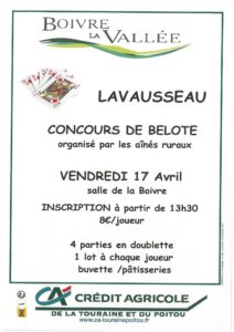 Vendredi 17 avril 2026 - 13:30 salle de la Boivre - 2 Grand Rue - Lavausseau - 86470 BOIVRE-LA-VALLÉEConcours de belote, organisé par Le club des aînés ruraux de Lavausseau : le vendredi 17 avril 2026 à la salle de la Boivre de Lavausseau. inscription à partir de 13h30 8€/joueur (4 parties en doublette) 1 lot à chaque joueur / buvette et pâtisseries sur place