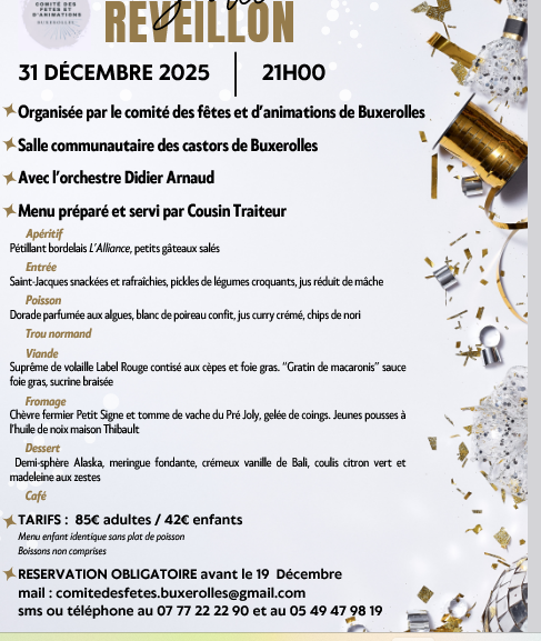 Mercredi 31 décembre 2025 - 09:00 salle des Castors - 48 avenue de la Liberté - 86180 BUXEROLLESLe Comité de Fêtes de Buxerolles organise le réveillon du 31 décembre 2025 salle des Castors à 21 H. avec l'orchestre Didier ARNAUD repas à 85€ (42€ pour les enfants) par Cousin traiteur. Réservation obligatoire avant le 19 décembre au 0777222290 ou 0549479819 comitedesfetes.buxerolles@gmailcom