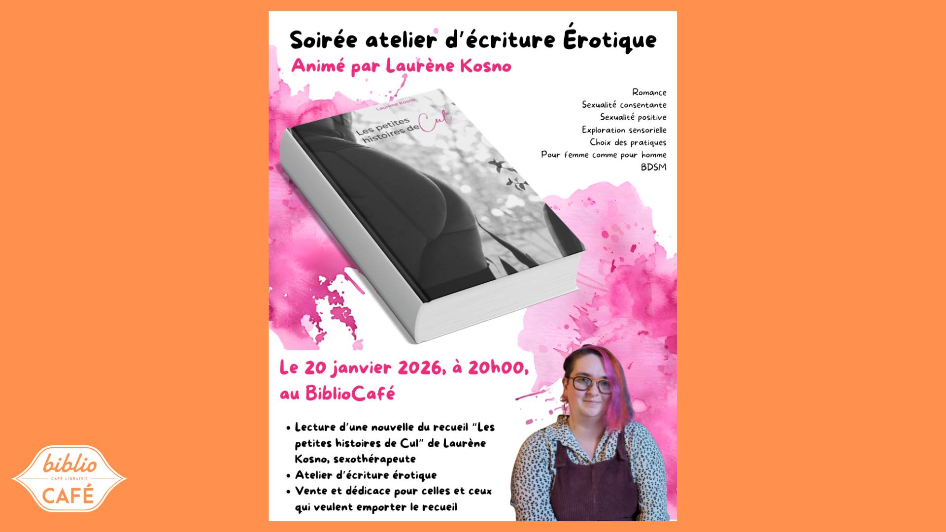 Mardi 20 janvier 2026 - 20:00 Le Biblio Café - 71 bis rue de la cathédrale - 86000 POITIERSLecture d'une nouvelle du recueil 'Les petites histoires de cul', atelier d'écriture érotique, vente et dédicace ! En savoir plus sur l'ouvrage et Laurène Kosno : https://sexpanse.fr/mon-livre-les-petites-histoires-de-cul/
