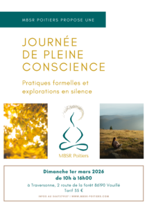 Dimanche 01 mars 2026 - 10:00 Vouillé - 2 route de la forêt - 86190 VOUILLEIl s'agit d'une journée en silence, mais les méditations sont guidées. Nous revisiterons différentes pratiques formelles de pleine conscience exercées au cours du programme MBSR et sommes invités à exercer notre pleine présence, à chaque instant, moment après moment.