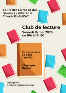 Samedi 16 mai 2026 - 16:00 Gîtes de Villaret le Tilleul - 3-5 Lieu-dit Villaret - 86400 BLANZAYPour son prochain club de lecture, l'association LE FIL DES LIVRES ET DES SAVEURS vous propose de lire Ce que je sais de Vera Candida de Véronique Ovaldé, un roman sensible autour des femmes, de la transmission et de l’émancipation et de venir en parler le samedi 16 mai de 16h à 17h30.
